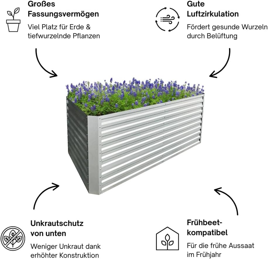 Die bequeme Beet Arbeitshöhe von 90 cm ist rückenschonend und macht die Gartenarbeit angenehm leicht, für Schädlinge wie z.B. Schnecken ist es zudem schwerer an die Pflanzen zu kommen, Langlebig und formbeständig: Die Wellblech Struktur machen den Planzkasten extra stabil und die aufwendige Zink-Aluminium Legierungsbeschichtung sorgt für eine hohe Korrosionsbeständigkeit