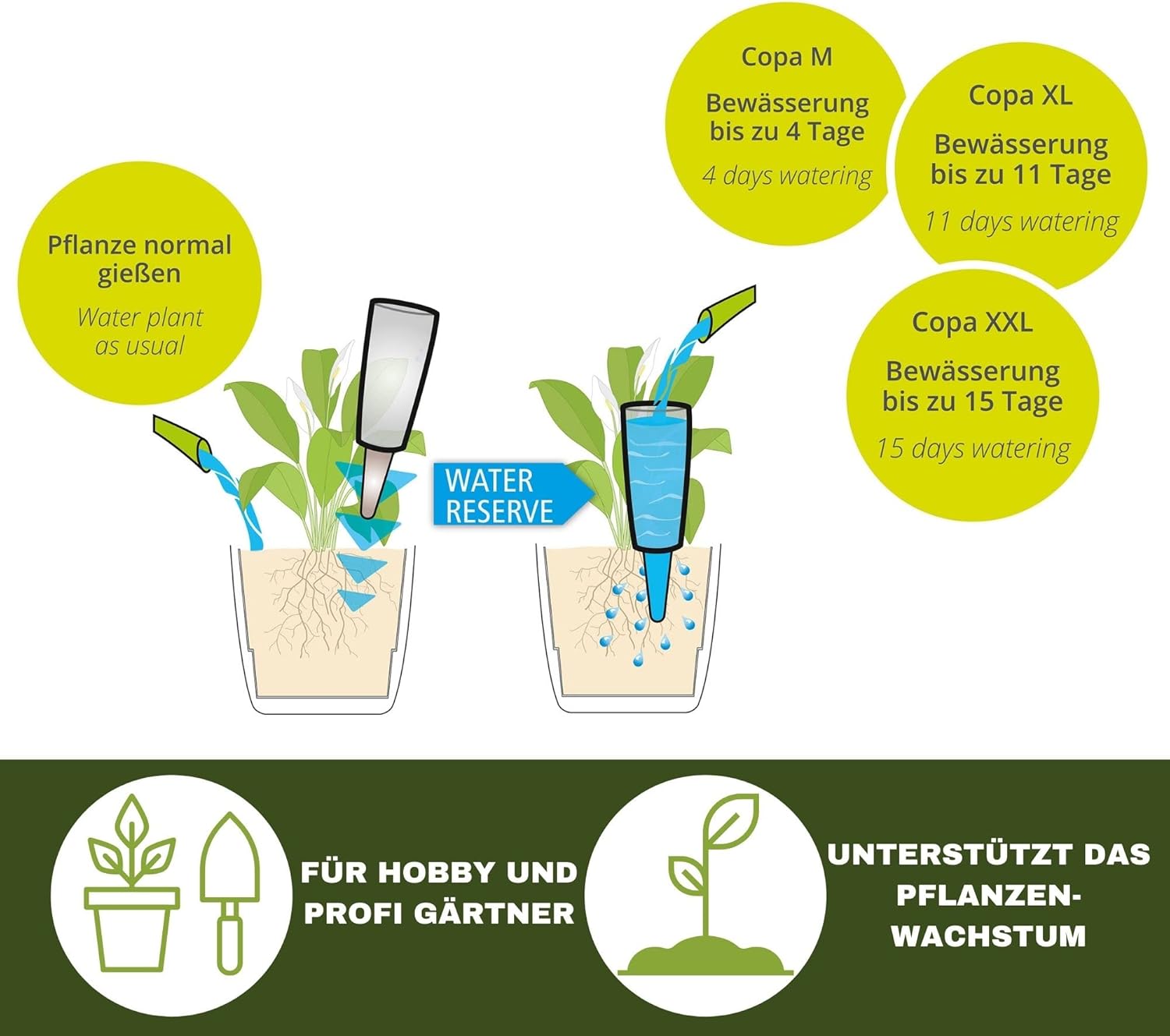 Bei optimalen Bedingungen kann die Bewässerungskugel für bis zu 4 Tagen die Pflanze mit ausreichendem Wasser vor dem austrocknen bewahren.