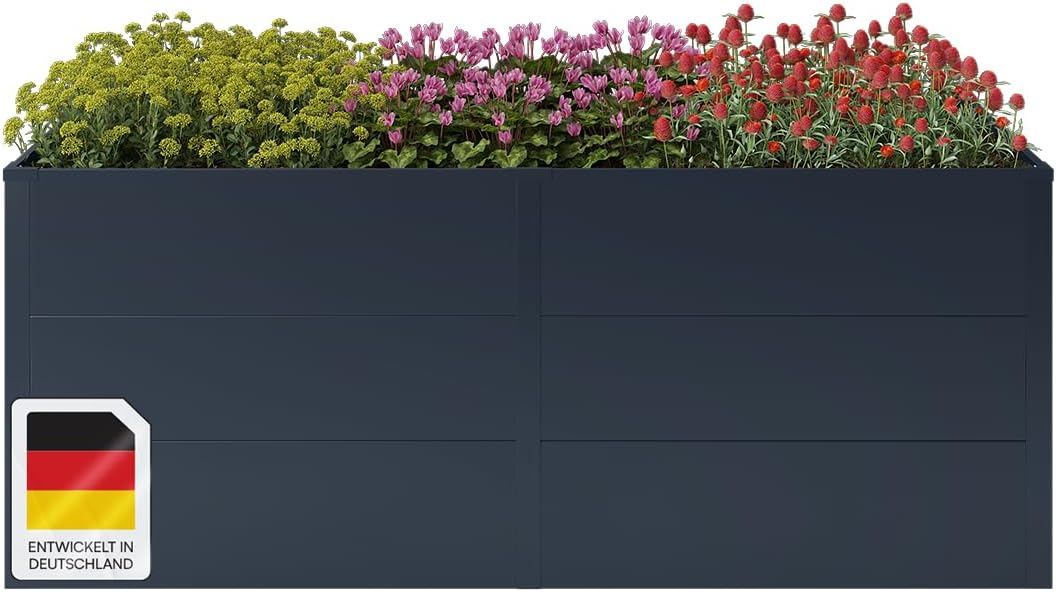 Gefertigt aus 0,8 mm starkem, verzinktem Stahl und veredelt mit einer spezialisierten Epoxid-Pulverbeschichtung in Anthrazit (RAL 7016), ist das Hochbeet optimal für den ganzjährigen Einsatz im Freien geeignet. Es trotzt Wind und Wetter, bleibt rostfrei und überzeugt durch eine lange Lebensdauer. Die pflegeleichte Oberfläche macht die Handhabung besonders unkompliziert.