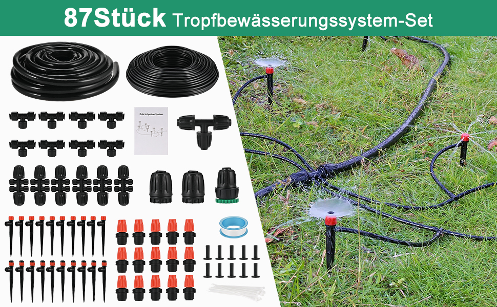 Ich habe dieses 87-teilige Bewässerungssystem gekauft, um ein ca. 6 Meter langes Blumenbeet sowie zwei große Gemüsebeete zuverlässig mit Wasser zu versorgen – und bin positiv überrascht, wie einfach und effizient das Ganze funktioniert.✅ Das hat mir besonders gefallen:🛠️ Einfache & dichte SteckverbindungenDie Schnellverbindungen machen die Installation wirklich kinderleicht – in wenigen Minuten war alles einsatzbereit. Die Teile passen gut, halten dicht und wirken insgesamt hochwertig verarbeitet.🚿 Vielseitige Sprinkler-AuswahlIm Set sind verschiedene Sprühköpfe enthalten – von Micro-Drip bis hin zu kleinen Sprühdüsen – sodass ich je nach Pflanzentyp die optimale Wasserverteilung einstellen konnte.💧 Effiziente WasserversorgungDas System bringt das Wasser gezielt an die Wurzeln und spart dabei sichtbar Wasser, da keine große Fläche verschwendet wird – gerade in trockenen Sommern sehr hilfreich.🌿 Flexibel einsetzbarOb Gemüsebeet, Blumenrabatte oder Topfpflanzen am Gehweg – das System ist sehr vielseitig und funktioniert auch bei verschiedenen Geländeverhältnissen gut.⚠️ Ein Hinweis zur Schlauchlänge:Am Ende der 6 Meter Strecke war der Wasserdruck spürbar schwächer. Wer also eine längere Strecke bewässern will, sollte ggf. einen dickeren Hauptschlauch oder einen zusätzlichen Druckregler einplanen.✍️ FAZIT:Ideal für alle, die schnell und unkompliziert ihre Beete bewässern wollen. Die Verarbeitung ist top, die Düsen flexibel einstellbar – nur bei größeren Distanzen stößt das Set an seine Grenzen. Für kleinere Gärten aber eine echte Erleichterung.