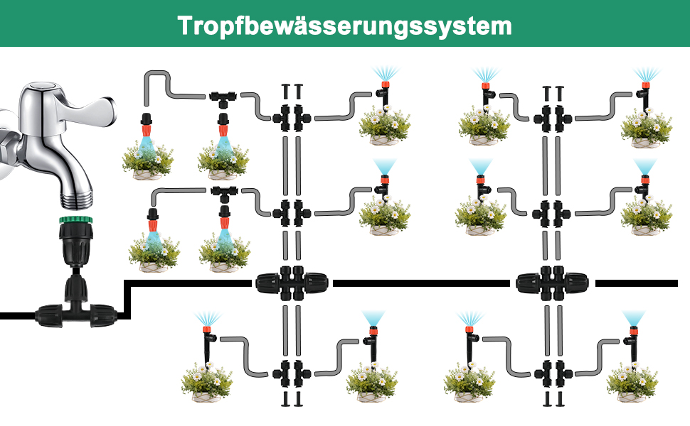Das Set enthält fast alles, was für eine einfache Bewässerung benötigt wird. Der mitgelieferte Anschluss ist nur direkt an den Wasserhahn möglich. Ein Anschluss an Gartenschlauch-Schnellkupplungen ist jedoch mit einer eigenen Kupplung vorgesehen. Das System lässt sich sehr einfach zusammenstecken und ist flexibel einsetzbar.Ich kann das Set nur empfehlen.Die Schläuche lassen sich leicht mit einem scharfen Messer auf die benötigte Länge zuschneiden. Von dem großen Versorgungsschlauch gehen dünnere Schläuche über Abzweigungen zu den Düsen.Es stehen drei verschiedene Düsen mit unterschiedlichem Sprühbild zur Verfügung.Die kleinen Schläuche werden einfach in die Kupplungen geschoben. Dort werden sie automatisch geklemmt, so dass sie fest sitzen und sich nicht von selbst lösen. Um die Schläuche zu entfernen, drückt man einfach den schwarzen Ring nach unten. So kann das System wieder zerlegt werden. Zum Verschließen nicht benötigter Ausgänge in den Abzweigungen sind Stopfen beigefügt.Die großen Schläuche werden mit einer Überwurfmutter an den Abzweigungen befestigt. Für den großen Schlauch liegt leider kein Stopfen bei. So muss an dessen Ende zwangsläufig immer ein kurzes Schlauchstück mit der Endkappe montiert werden. Oder man bildet einen Ring mit einer Einspeisung zur besseren Druckverteilung.Das Set kann einfach mit jedem 1/2 Zoll Schlauch verlängert werden.Die Montage und Demontage ist sehr einfach. Die Qualität ist sehr gut und das Set sehr umfangreich.