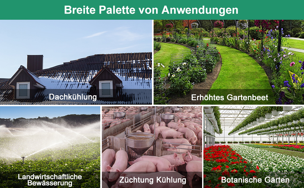 Vielseitige Anwendung für jeden Garten: entwickelt für eine Vielzahl von Außenbereichen wie Rasenbewässerung, Terrassen, Gärten, Gemüsebeete, Dachkühlung, Landwirtschaft, Blumenbeete, Gewächshäuser, Poolnebelkühlung und Hochbeete. Dieses neue bewässerungssystem indoor & outdoor ist Ihre All-in-One-Lösung für einen üppigen und gepflegten Garten.