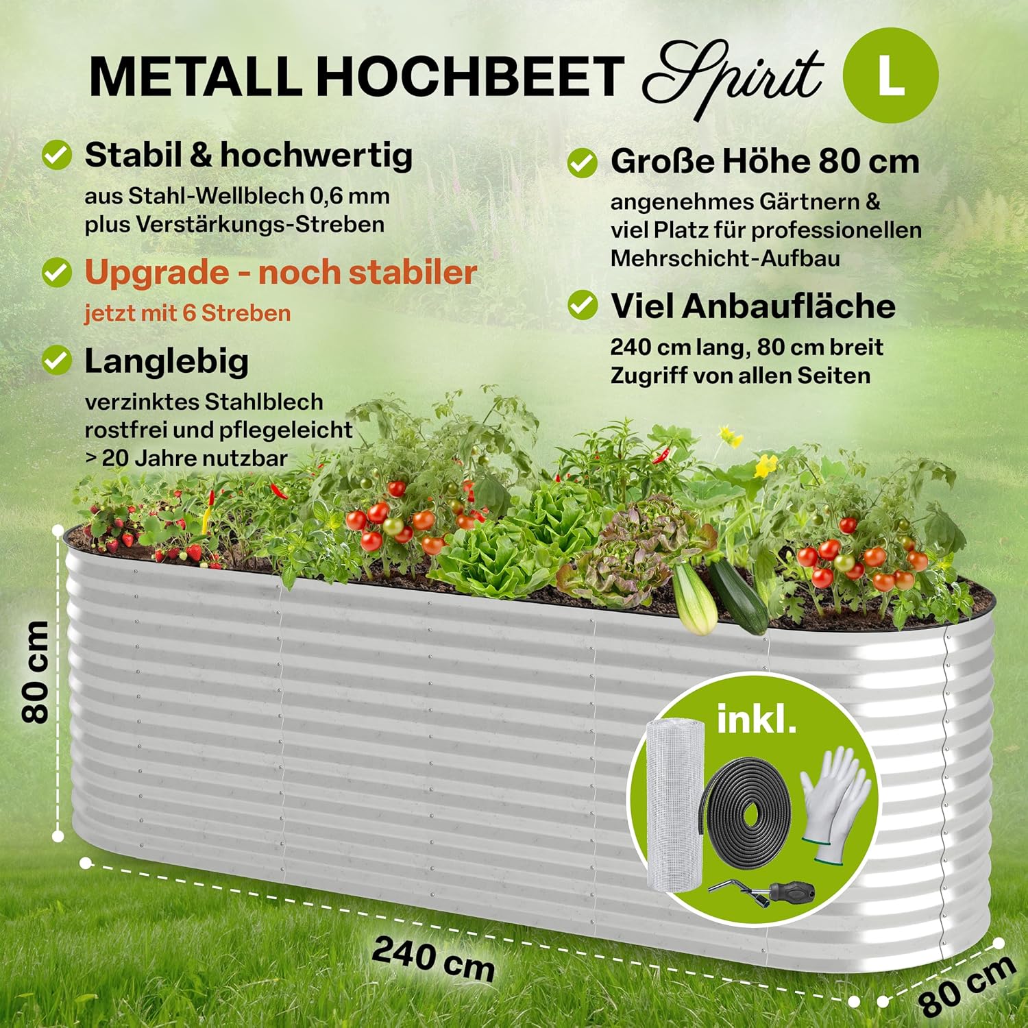 👨🌾 𝑨𝑻𝑻𝑹𝑨𝑲𝑻𝑰𝑽 𝑼𝑵𝑫 𝑷𝑹𝑨𝑲𝑻𝑰𝑺𝑪𝑯 – 𝑼𝑷𝑮𝑹𝑨𝑫𝑬 – 𝑱𝑬𝑻𝒁𝑻 𝑵𝑶𝑪𝑯 𝑺𝑻𝑨𝑩𝑰𝑳𝑬𝑹! – dieses 240 x 80 x 80 cm große ovale Metall Hochbeet der „Spirit“ Serie verbindet modernes, helles Design kombiniert mit bester Funktionalität und Ausstattung. Dank 80cm Full-Size Höhe ermöglicht es einen vollwertigen, mehrschichtigen Beetaufbau. Das Metall-Hochbeet aus verzinktem Stahlblech ist witterungsbeständig und pflegeleicht. Vollwertiger Lieferumfang inklusive!