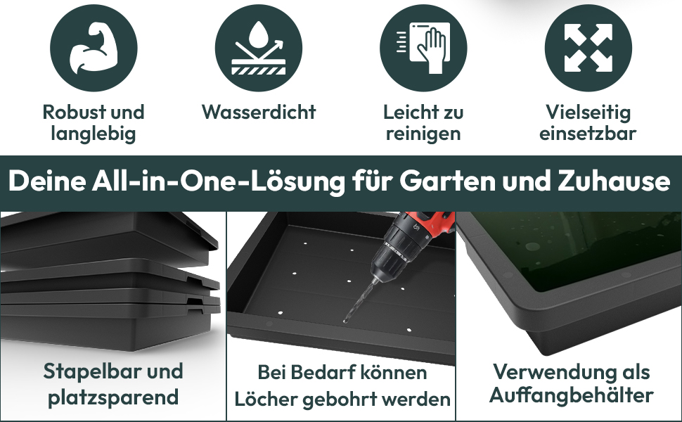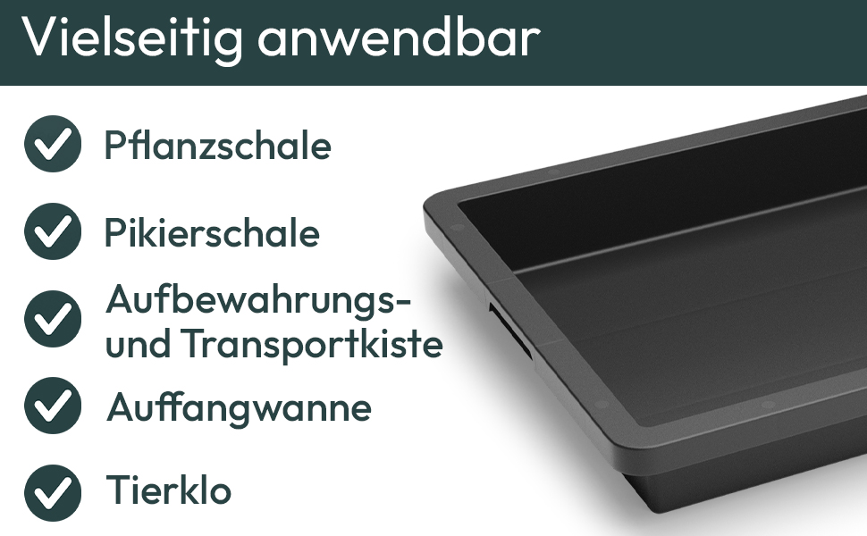 🌿 VIELSEITIG EINSETZBAR – Diese flache Wanne eignet sich ideal als Pflanzschale, Auffangbehälter, Aufbewahrungskiste oder Pikierschale. Sie ist unverzichtbar für jede Anzucht, Pikierarbeiten oder die Aufbewahrung von Pflanzgefäßen.