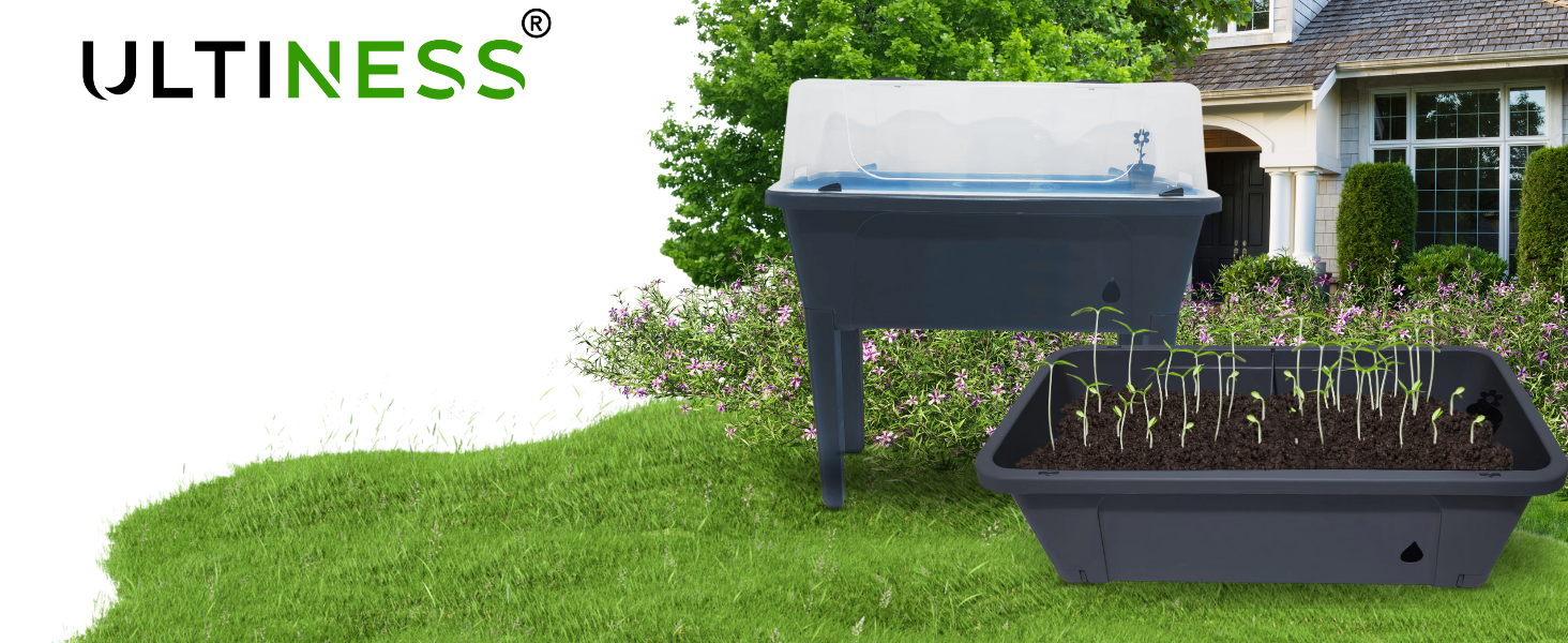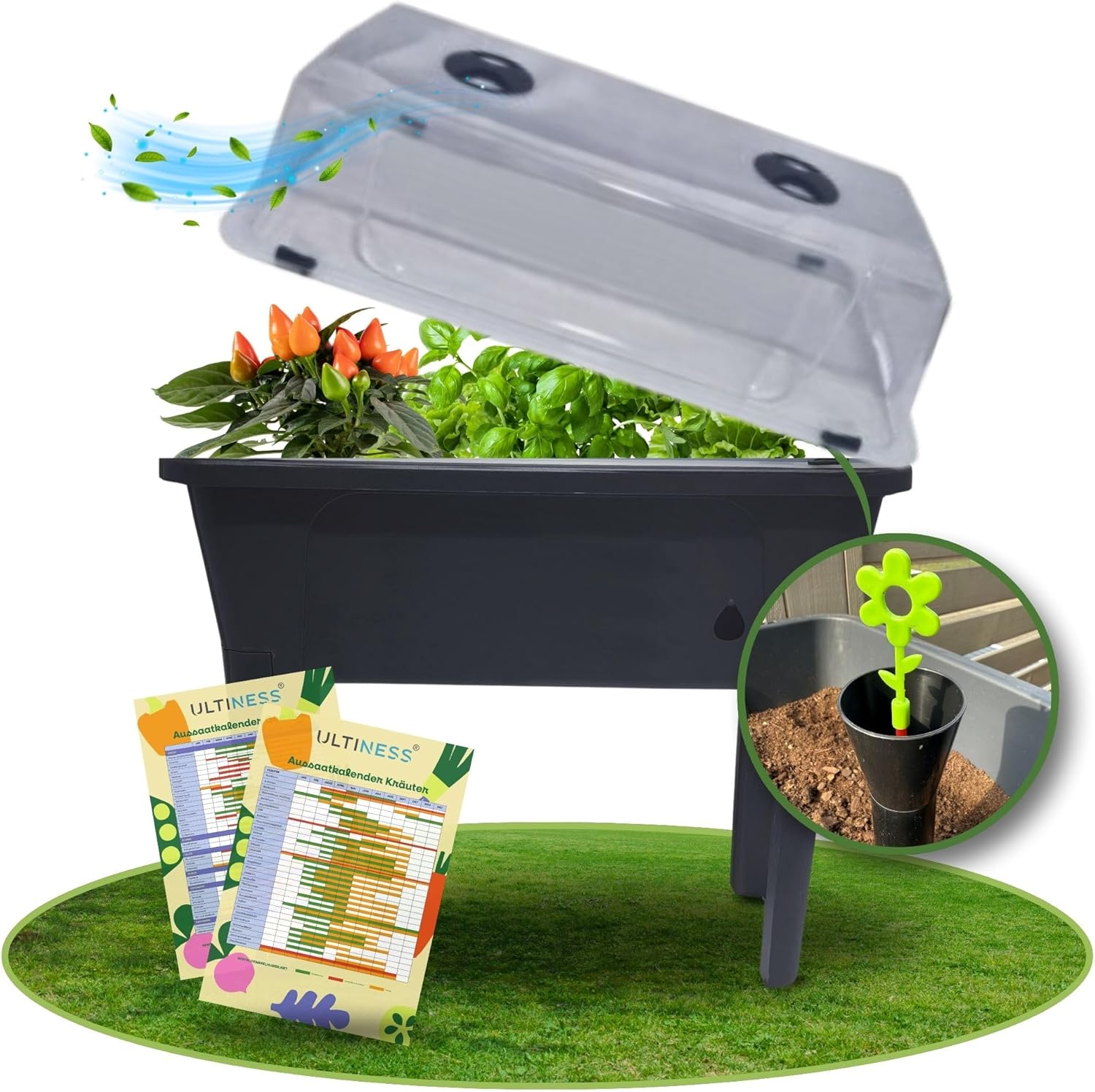 Ultiness Hochbeet Anabell bietet Ihnen alles, was Sie für den erfolgreichen Gemüse- und Kräuteranbau benötigen – Abdeckung, Wasserstandsanzeige und Drainage. Ideal für Anfänger, die sich das Gärtnern leichter machen wollen.