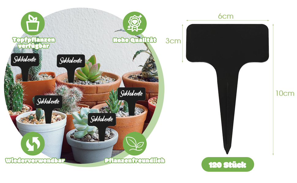 【Packungsinhalt】Jedes Set enthält 120 T-förmige Pflanzenschilder mit einer Größe von ca. 6×10 cm, einer Schreibfläche von 6×3 cm. Die Schilder können auf beiden Seiten beschriftet werden und eignen sich für eine Vielzahl von Topfpflanzen. Zudem werden 2 wasserfeste permanente Marker mitgeliefert.