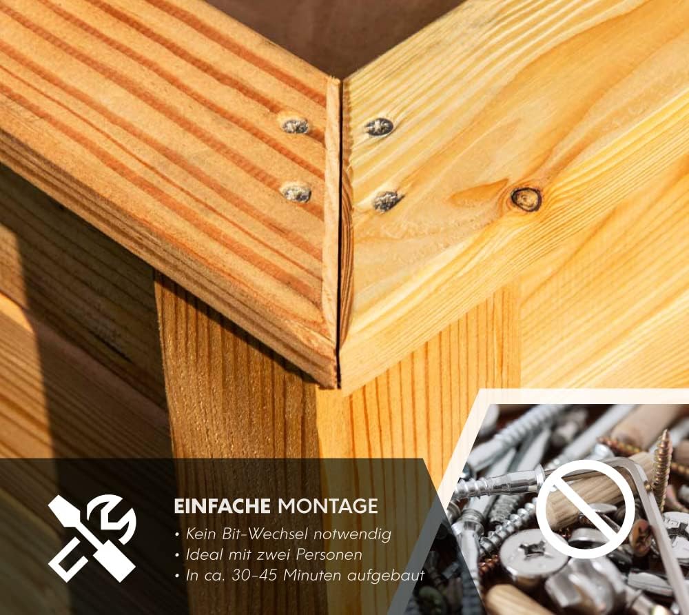 KINDERLEICHTER AUFBAU: Das Hochbeet ist in ca. 30 – 45 Minuten in Ihren Garten, der Terrasse oder dem Balkon aufgebaut. Während des Aufbaus ist kein Bit-Wechsel notwendig und mit zwei Personen schnell und einfach montiert!