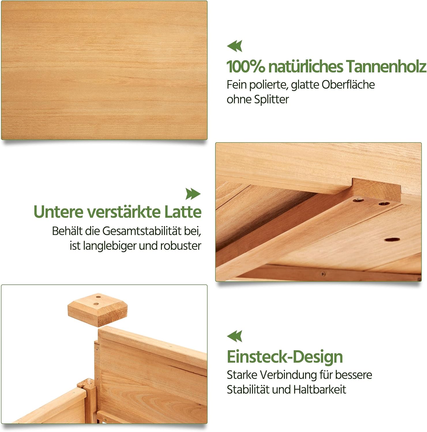WITTERUNGSBESTÄNDIG: Besteht aus dauerhaftem Spießtannenholz, das für seine Festigkeit und Formbeständigkeit sowie eine natürliche Resistenz gegen Fäulnis und Schädlinge bekannt ist, robust und langlebig. Das Gartenhochbeet ist so gebaut, dass selbst bei langer Nutzungsdauer nur ein geringer Wartungsaufwand notwendig ist