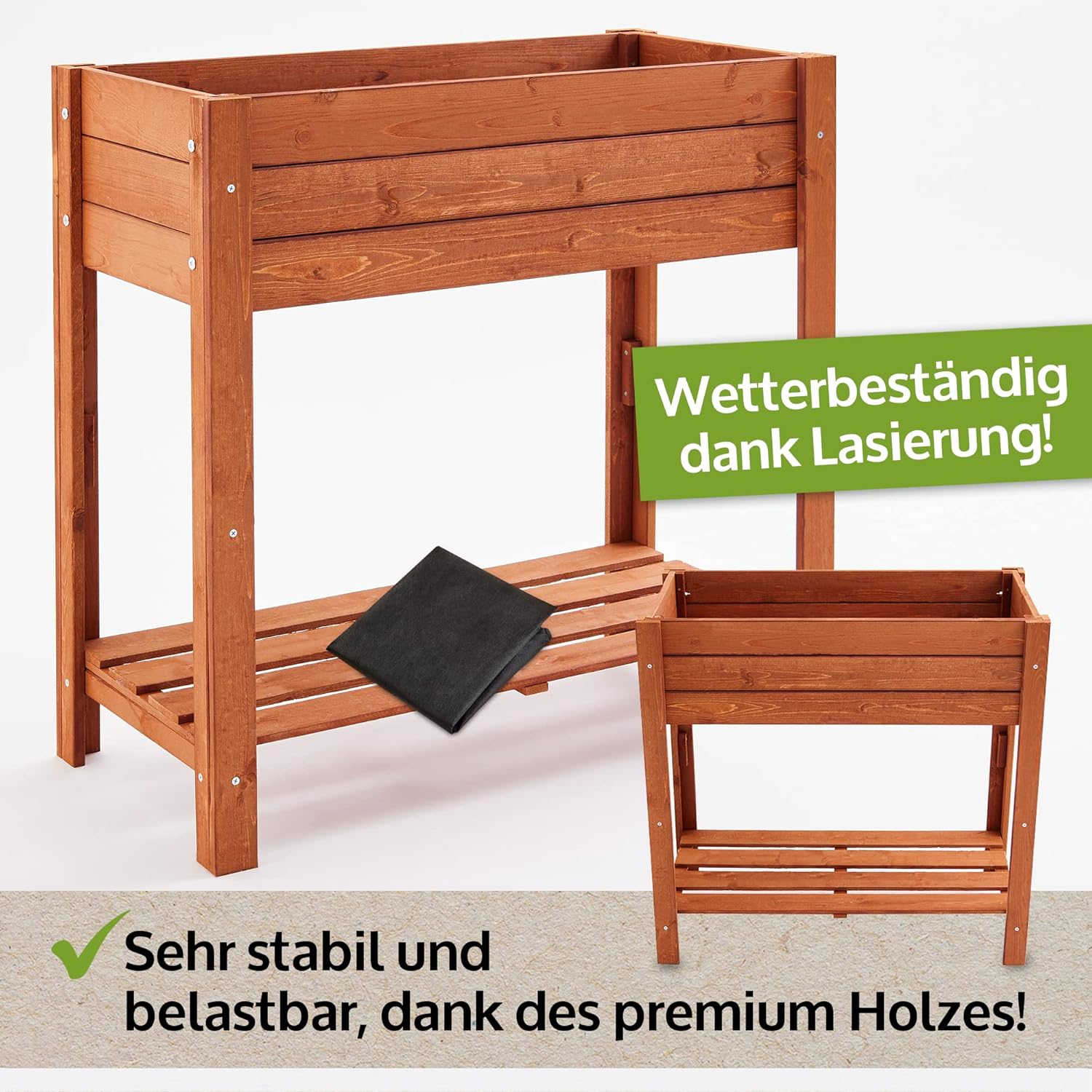 PREMIUM HOLZ – Das langlebige und witterungsbeständige Beet mit zusätzlicher Ablage und Innenvlies besteht aus hochwertigem stabilem Kiefernholz. Der stabile Pflanzentisch überzeugt durch die gute Verarbeitung und seiner hohen Belastung