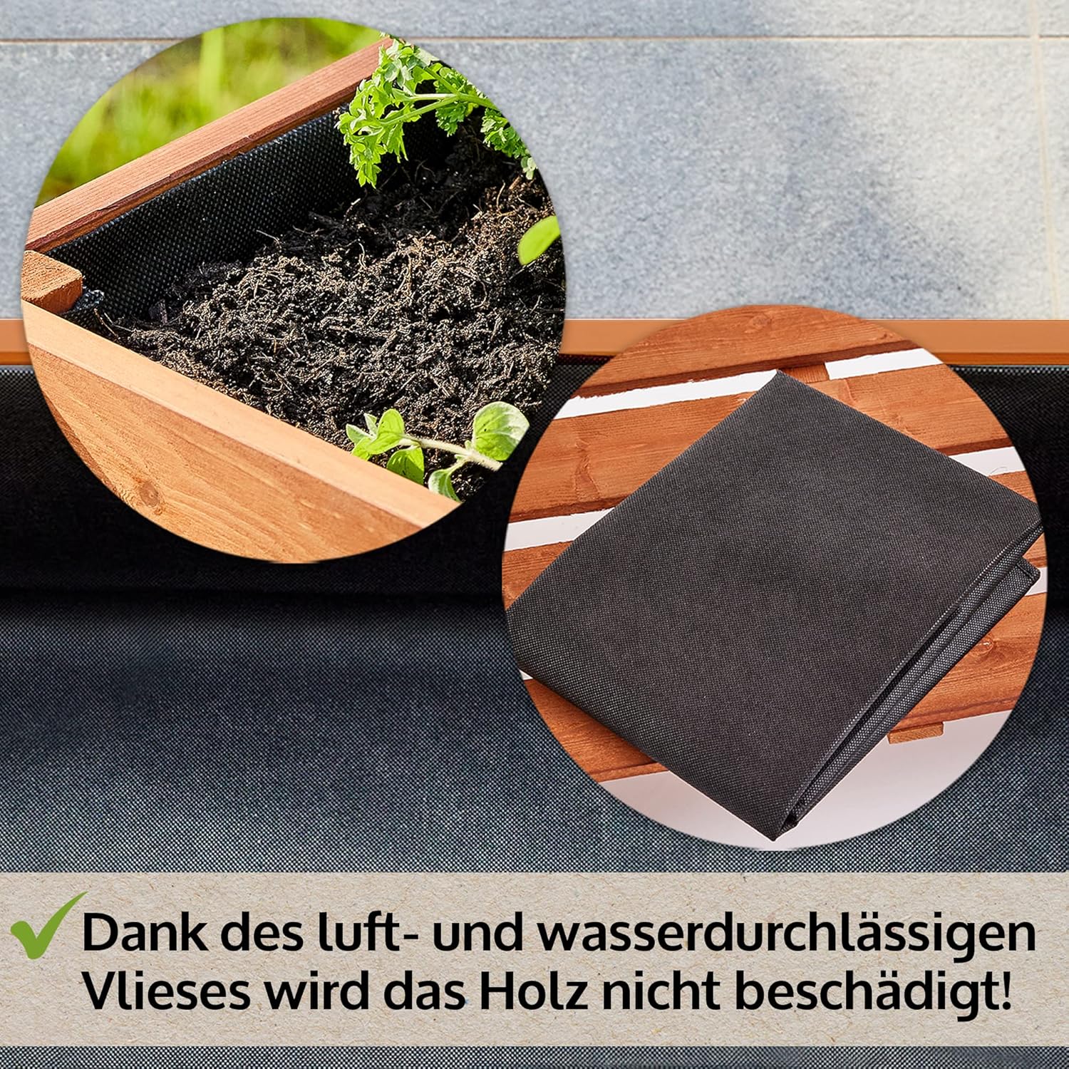 Zum Hochbeet wird ein passendes luft- und wasserdurchlässiges Innenvlies geliefert. Das dicke Vlies ist zudem wetterbeständig und reißfest. Das Holz des premium Hochbeetes wird somit optimal geschützt.